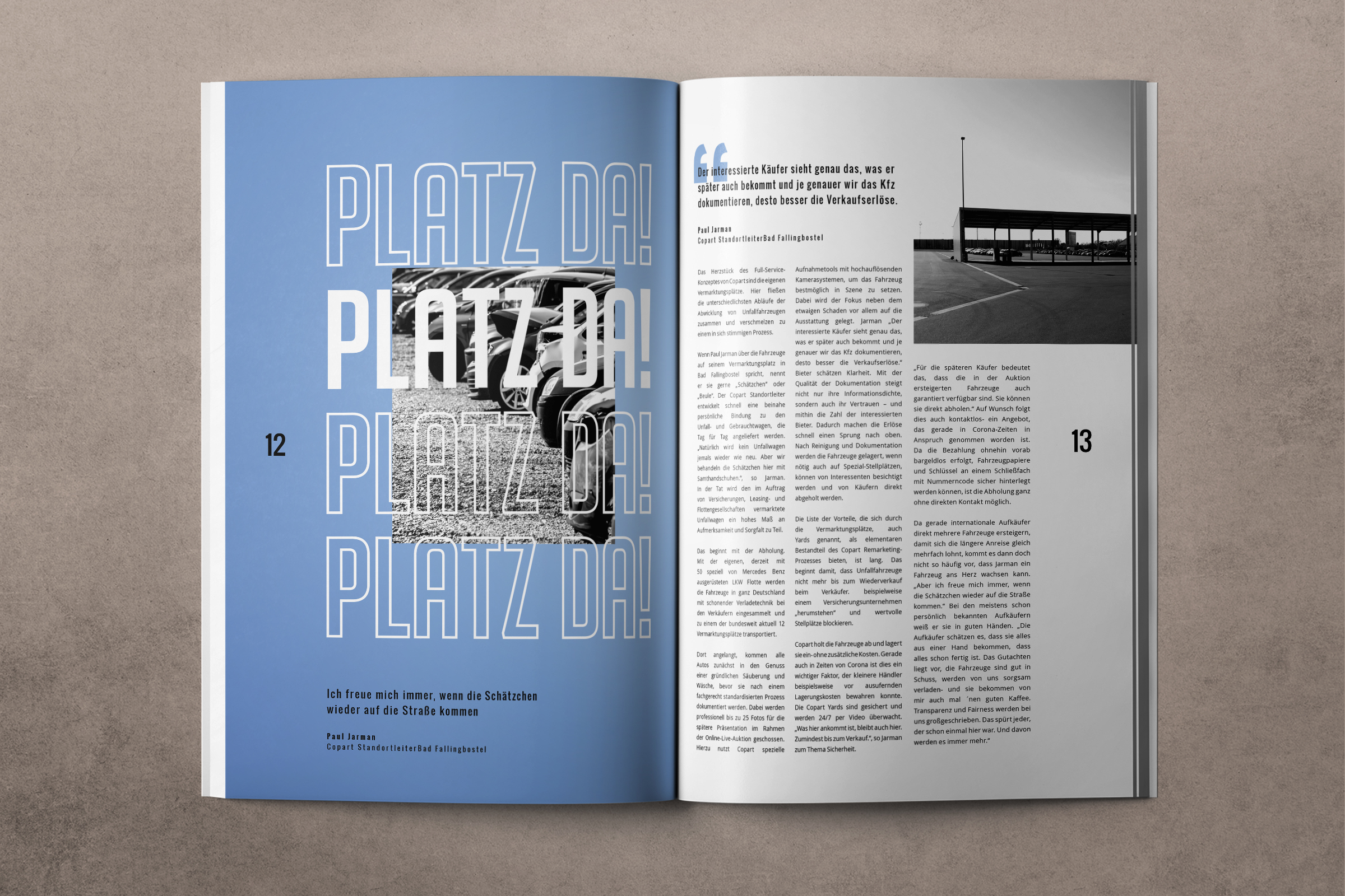 Die Aufgabe: ein Kundenmagazin entwerfen, um Bekanntheit und Reichweite zu steigern. Ein Image aufbauen. Die Herausforderung: Unfallfahrzeuge in einem hochwertigen Umfeld platzieren.